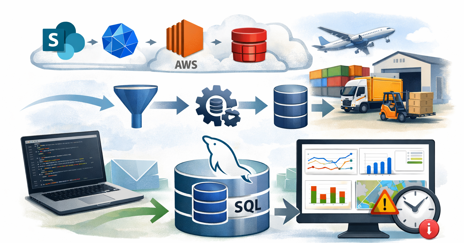 End-to-end ETL integrating SharePoint/Microsoft Graph and logistics APIs into a queryable MySQL layer with automated reporting.